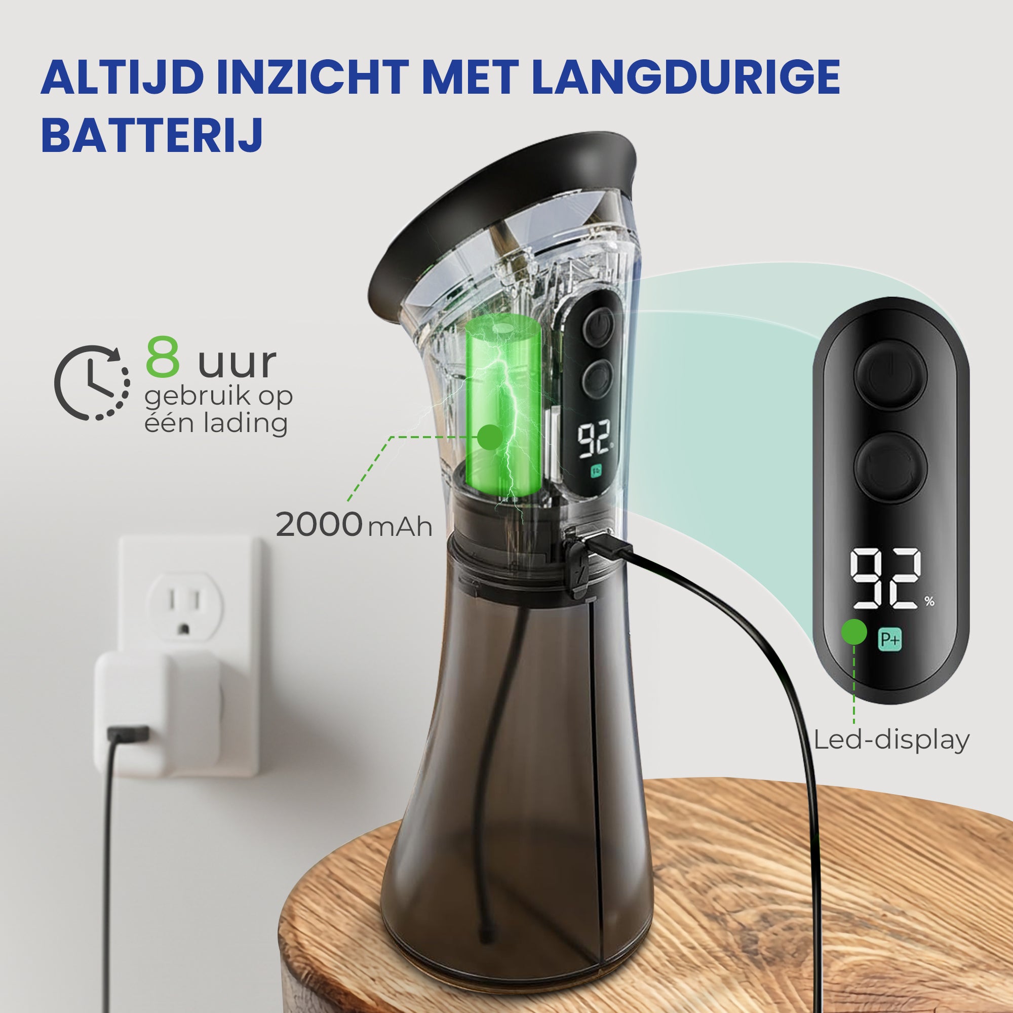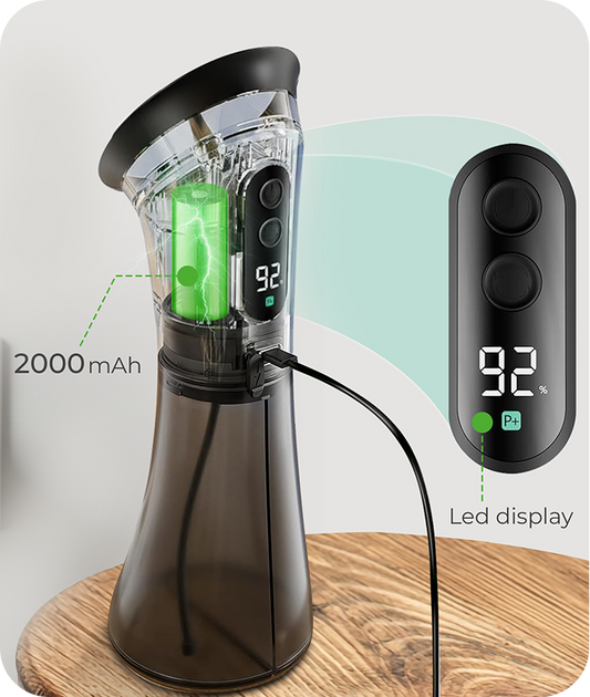 The 2000mAh battery provides up to 8 hours of use on a full charge. The LED display clearly shows battery status and the active mode.