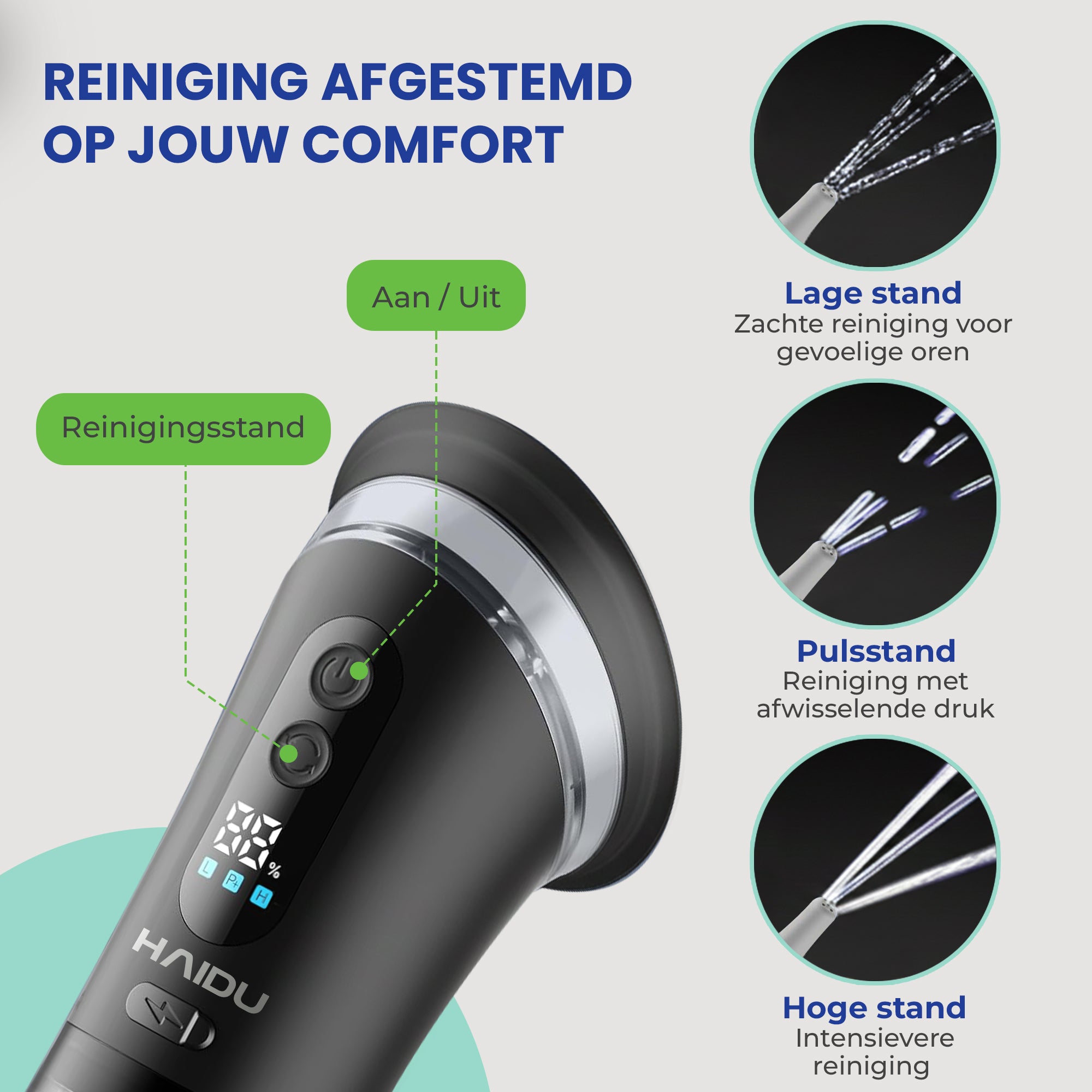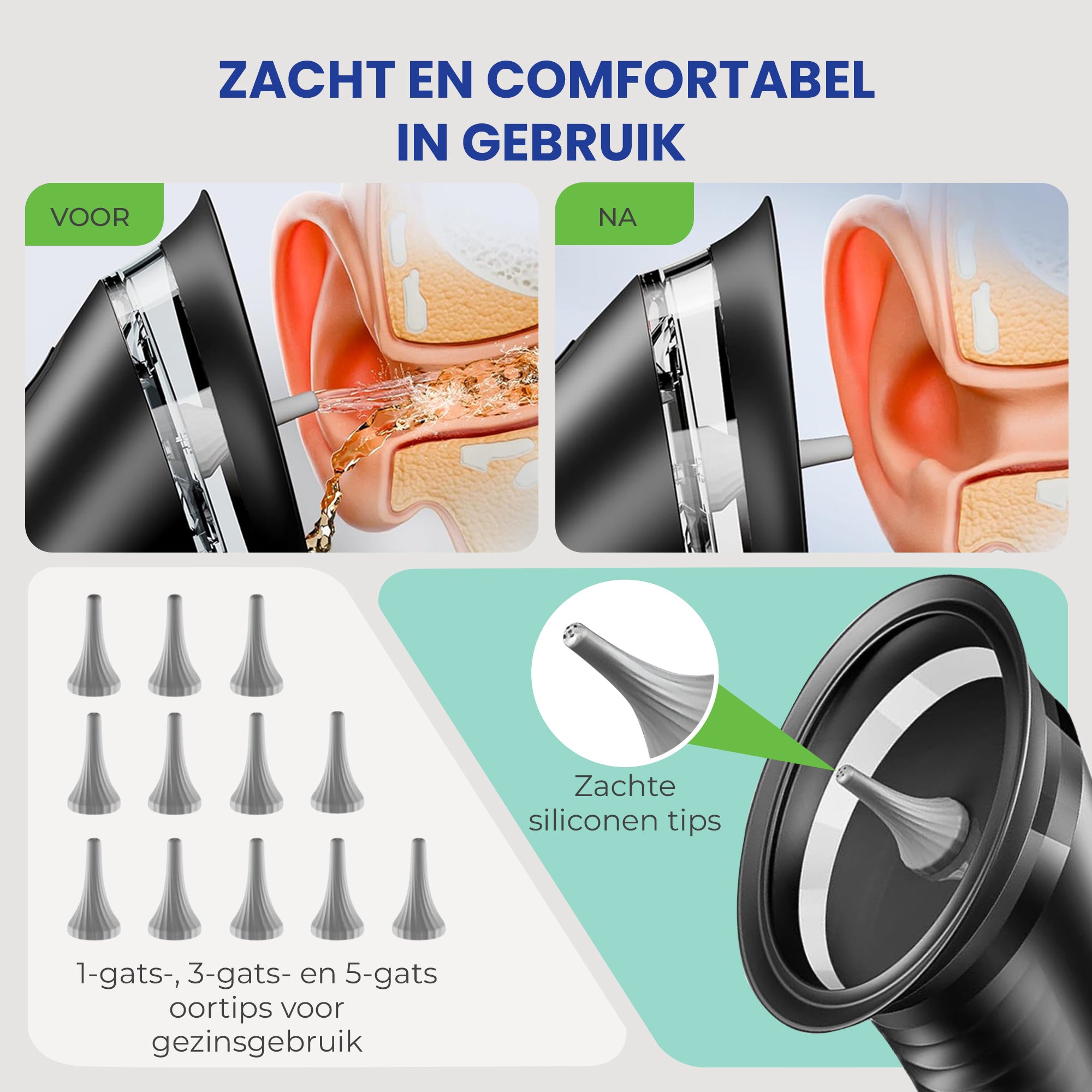 1-Hole Tip: Extra gentle, ideal for sensitive ears 3-Hole Tip: Balanced flow for everyday use 5-Hole Tip: More powerful for deeper cleaning