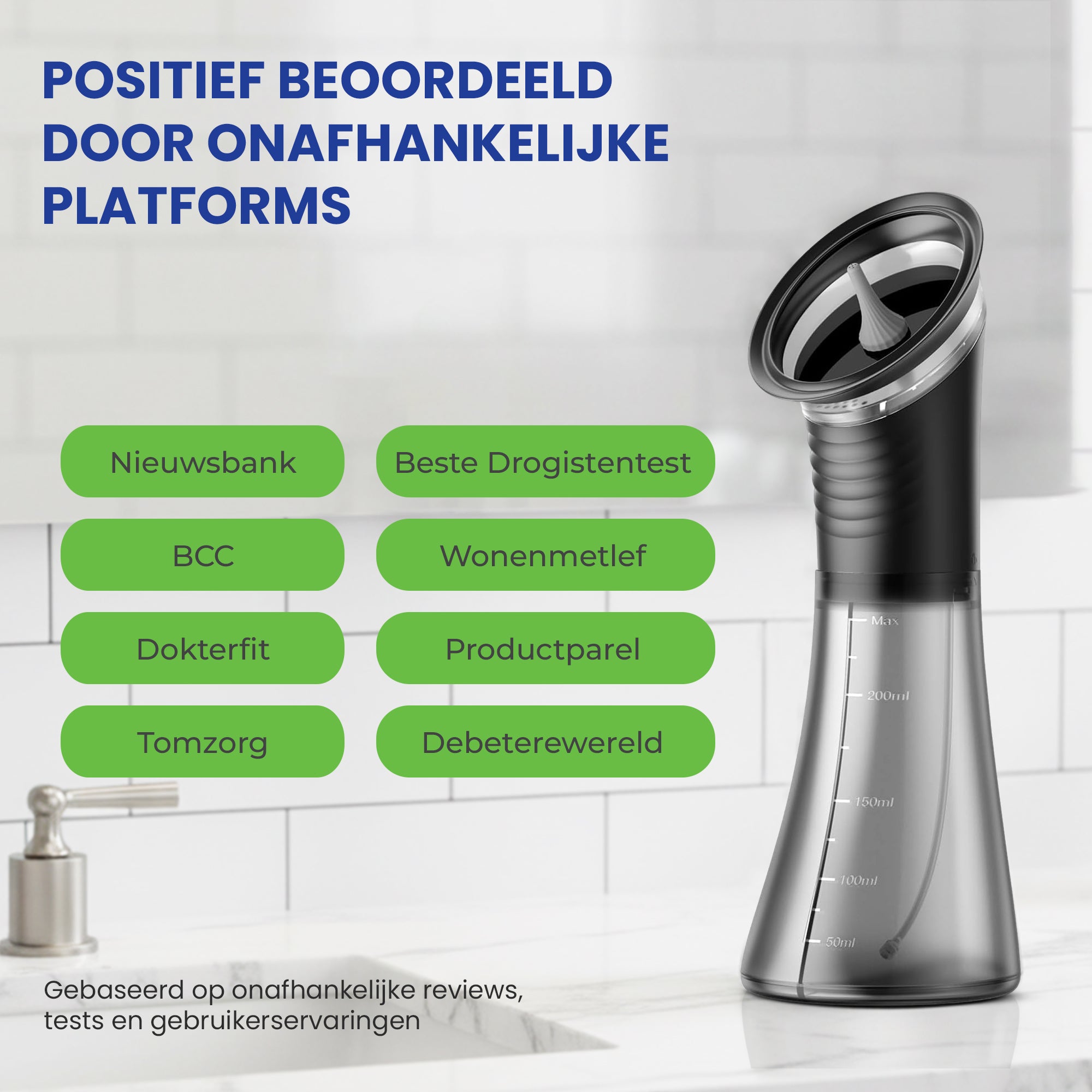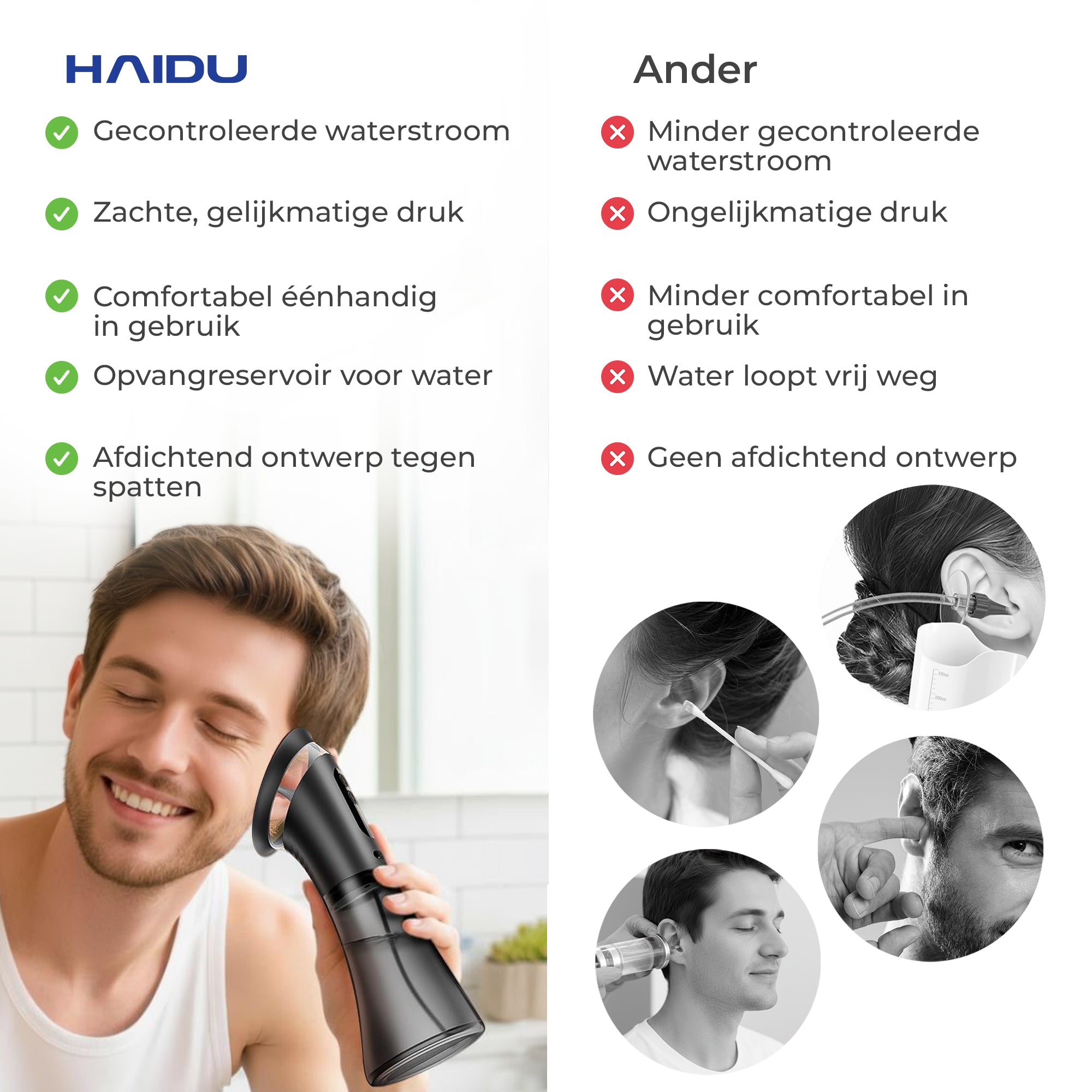 It features a unique shield design that fully covers the ear, collecting all water neatly without splashes or mess. It also has a dual water reservoir for clean and waste water.