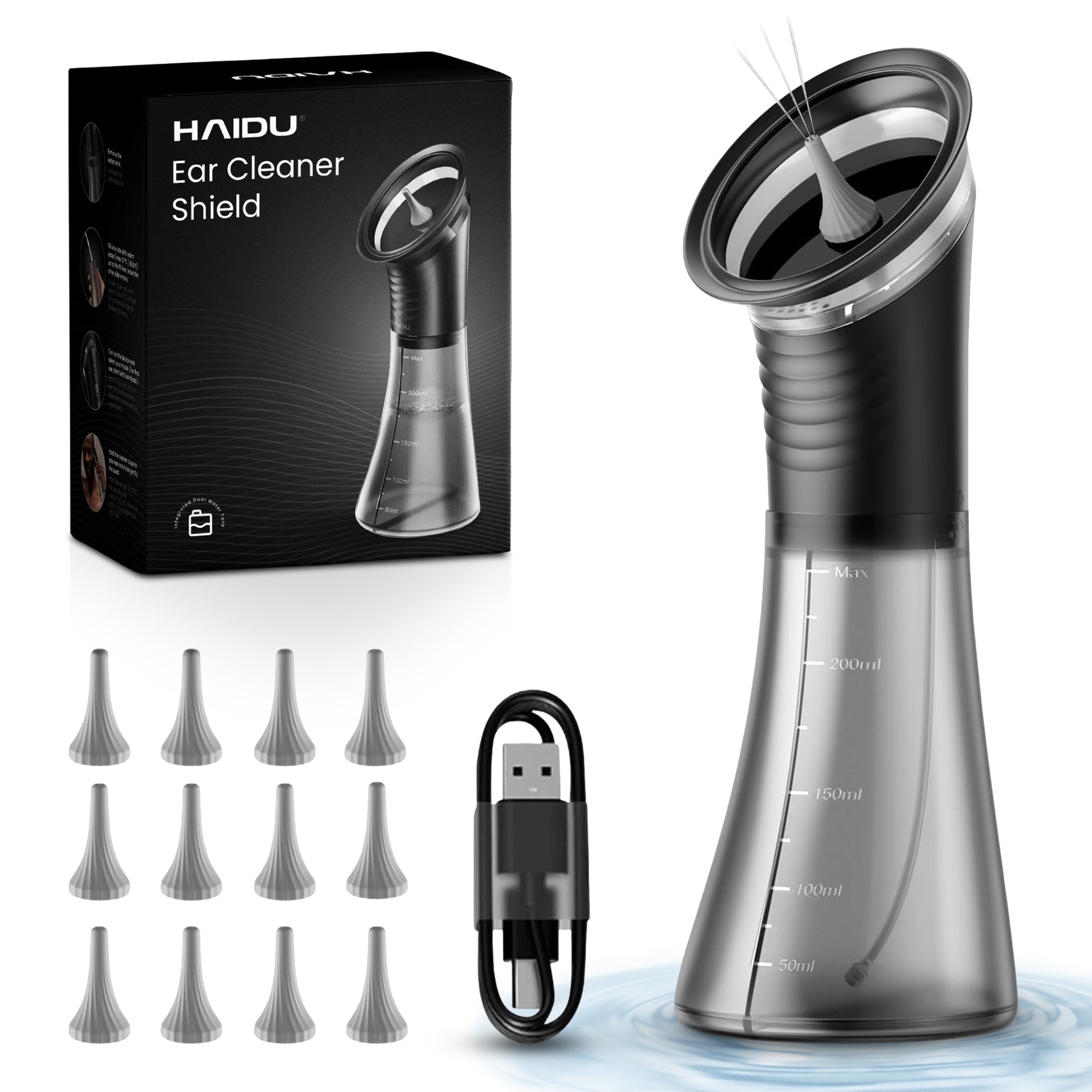 The HAIDU Ear Cleaner Shield offers a safe, effective, and hygienic way to remove excess earwax without mess or discomfort. Its dual water reservoir and Shield design fully cover the outer ear, ensuring all water is neatly collected. With three cleaning modes, multiple ear tip types, and a powerful rechargeable battery, this device is ideal for adults and children aged 8+ experiencing earwax buildup, blockage, pressure, or temporary hearing loss.