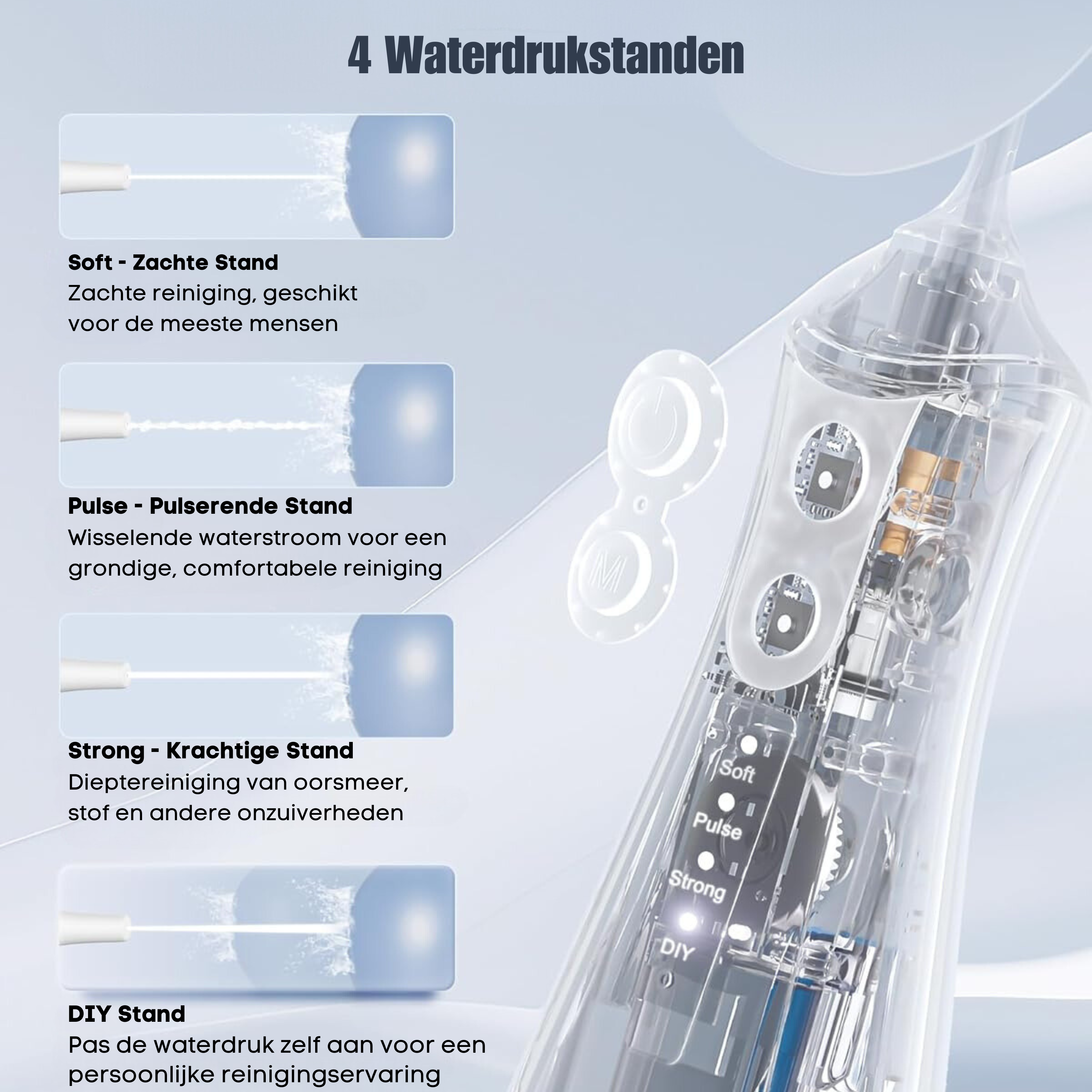 Innovativa impostazione della pressione fai-da-te : pressione regolabile da 20 a 140 PSI per un'esperienza personalizzata, con una scelta di quattro modalità: modalità delicata, modalità a impulsi, modalità forte e modalità fai-da-te.